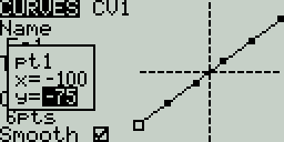 After the last configuration option (Smooth), you will automatically begin to scroll through the configured points on the curve. To change the values of the points, press the [Enter] button and then adjust the values as desired. For Standard curves, you will only be able to adjust the Y value. For Custom curves, you can adjust both the X and Y values.