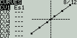 The Curves screen allows you to define custom curves to use in the Inputs, Mixes, or Output screens. The curves screen will show the configured custom curves, with a graphical representation of each curve.