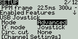 If using the radio as a USB Joystick, both internal and external RF modules should be turned off. When configured as such, the mixer will run at 1000Hz when in Joystick mode (which is needed for F.Sim competitors). Additionally, it also displays mixer run time in statistic/debug screen. This will result in increased performance when connected to a computer via USB. The advanced joystick mode is not available for black-and-white display radios with less than 1 MB of flash memory due to this feature not fitting into the available memory footprint.
