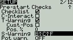 S-Warning - The section displays all the switches that are configured on the radio and allows you to select which position is the correct position for the switch state check. Selecting the switch will cycle through the available switch positions or turn the check off for the switch completely. A long press of [Enter] while this section is highlighted will set all the switch positions to the currently configured physical positions of the switches.