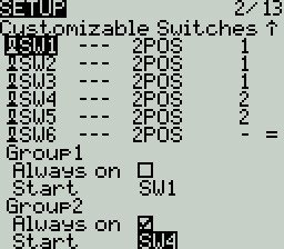 To use customisable switches like a traditional hardware 6-POS implementation (Horus, TX16S,...), leave the customizable switches at the default settings (all switches set to 2POS, Group 1). Configure Group 1 to be "Always On" and SW1 to be selected on model/radio start. You can then use select GR1 on the input or mixes page, to get just like the prior 6-POS behaviour.