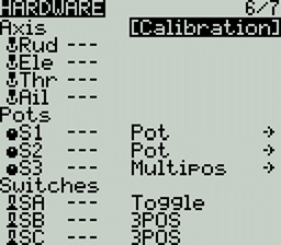 The Hardware screen is where you configure hardware specific-settings for your radio. It shows all physical hardware objects (sticks, pots, switches) and allows for their modifications. It is also where you can calibrate your sticks and pots. It also contains additional configuration options.
