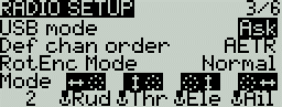 Def Chan Ord - The default channel order for new models and the trainer screen. The letters stand for: A = Aileron, E = Elevator, T = Throttle, R = Rudder. Changing this setting does not affect existing models. On Surface Radios, the letters stand for S=Steering, T=Throttle.