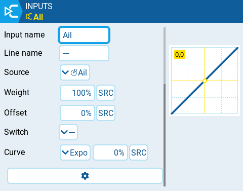 Expo -The input value is changed exponentially. Increasing the % will result with a gentle slope near the middle(0). Decreasing the % will result in a steep slope near the middle (0). With a % of 0, the slope will be linear. In addition to percentage value, you can use other inputs, physical controls, MAX (always returns 100), MIN (always returns -100), cyclics, trim switches, channel values and more, using the "SRC" button.