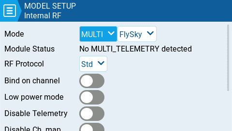 Multi - Multiprotocol Module. The configuration options are unique to each selected protocol Configuration options for the multi-protocol module are described here: https://www.multi-module.org/using-the-module/protocol-options
