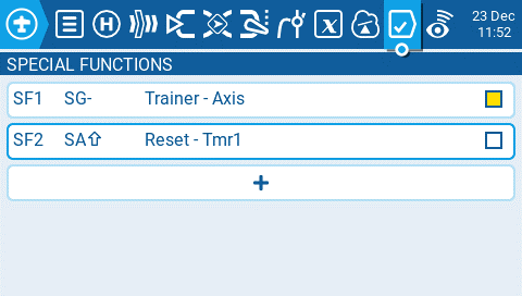Lua Script - Executes the Lua script defined in the value field. The Lua script must be located in /SCRIPTS/FUNCTIONS/ folder on the SD card. Lua scripts that display information on the screen cannot be executed with this special function.