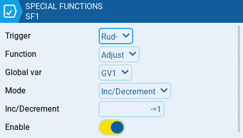 **Step 3:** We will now create 2 [Special Functions](https://manual.edgetx.org/color-radios/model-settings/special-functions) to adjust the **GV1** value we created in the previous step. Navigate to the [Special Functions](https://manual.edgetx.org/color-radios/model-settings/special-functions) page and create a new function **SF1** for decreasing **GV1**